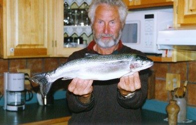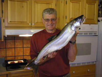 Und wieder ist das Abendessen ( Dinner ) gesichert, denn ein 3 1/2 pfündiger Kokanee-Lachs ( blankes Silber ) konnte dem Glow-Hook nicht wiederstehen
