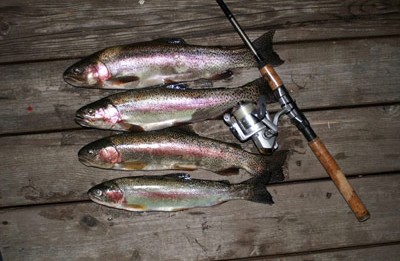 Vier schöne Regenbogenforellen konnten der Streamer-Fliege beim Schleppangeln nicht wiederstehen