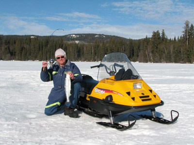 Im Winter fahren wir mit dem Snowmobil + mit Eisborer und Eisangel bewaffnet, über den ca. 20 km langen Deka-Lake vor der Haustüre