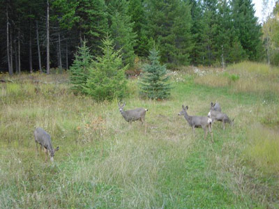 Ein Rudel Hirsche ist auf der Wiese vor dem Küchenfenster beim Äsen