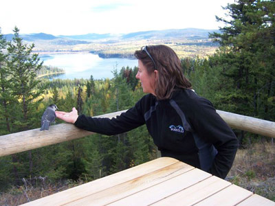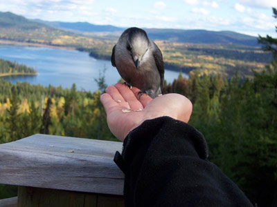 Die Grauhäher sind sehr zutraulich und nehmen die Haferflocken von der Hand